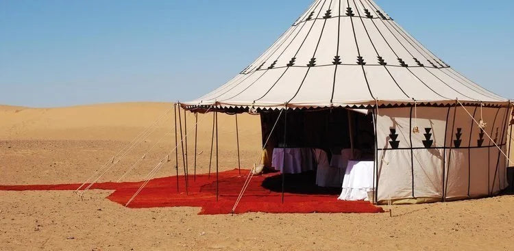 Handcrafted to order, each tent is unique, ideal for homes, hotels, festivals, workshops, or yoga. With over fifteen years of experience in traditional Saharan tents, our artisans bring authenticity, elegance, and storytelling to every piece, connecting guests to the heritage, energy, and spirit of Morocco.